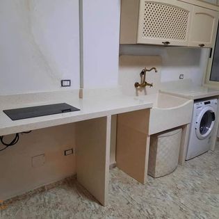 Struttura in graniglia di marmo bianco botticino, realizzata da artigiani su misura e in base alle esigenze del cliente.